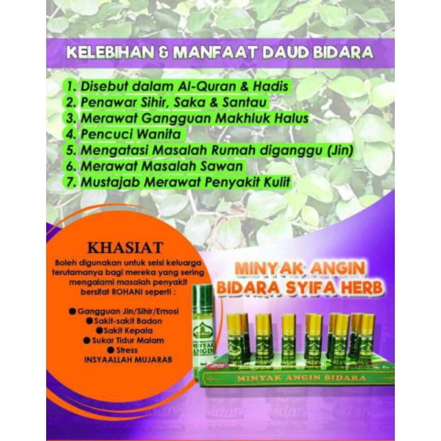 Orang zaman dulu menggunakan daun bidara untuk mandi. Daun ini akan menghentikan pendarahan dan mengeringkan luka agar cepat pulih sehingga. Mengingat khasiat dan kegunaan minyak jafaron sangat banyak danjuga harga minyak jafaron asli yang mahal, sehingga banyak yang memanfaatkannya untuk melakukan kecurangan dengan salah. Bidara (ziziphus mauritiana) terlihat menyerupai tumbuhan semak belukar dan proses pertumbuhannya terbilang cepat. Dah macam2 cara cuba nak tidur nyenyak tapi takboleh. Sering dikaitkan sebagai tanaman pengobatan sihir, inilah sejumlah manfaat dan khasiat daun bidara ternyata luar biasa yang dijelaskan dalam al quran. Keanekaragaman hayati yang ada tersebut dapat di manfaatkan sebagai bahan baku obat. Daun bidara mengandung senyawa antibakterial, sehingga sangat efektif untuk mengobati penyakit akibat bakteri ataupun virus. Ia bukan saja sangat bagus untuk di makan dengan rasa yang sedap. Insyaa alloh khasiat daun bidara : Hal ini karena buah ini dapat memberikan asupan nutrisi pada otak sehingga otak menjadi lebih sehat, yang selanjutnya juga. Khasiat & fungsi untuk membantu menyelesaikan masalah: Lihat video dibawah untuk lihat keajaiban khasiat minyak bidara.