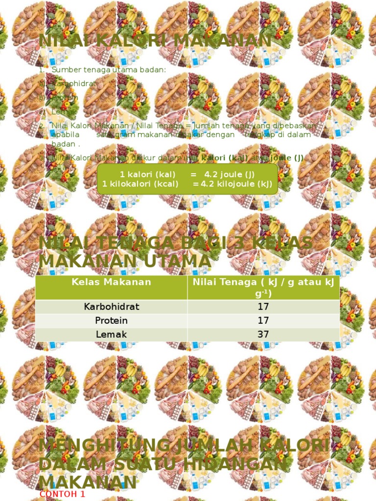 Kandungan kalori dalam makanan bergantung kepada kandungan karbohidrat, protein dan lemak.
